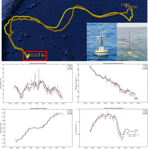 注:250和380為漂流式海氣通量浮標編號;紅色和棕色圓點為浮標漂流軌跡;漂流式海氣通量浮標觀測數據為10分鐘1次的原始數據,KEO數據為延時1小時1次數據;截止目前,KEO浮標只有1天的觀測數據供比測用,其中海表面溫度數據缺失;漂流式海氣通量浮標隨洋流逐漸遠離KEO浮標,紅色方框范圍內浮標軌跡點為比測位置。