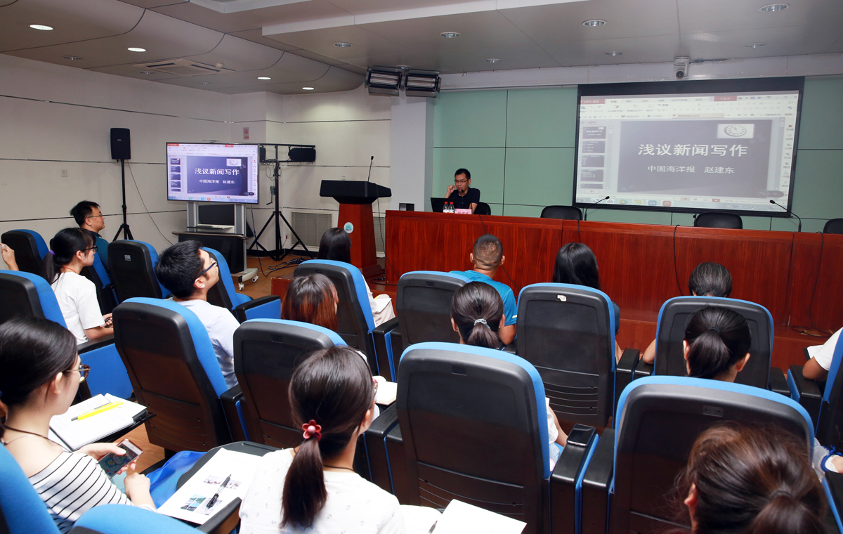 培訓班上,中國海洋報新聞中心總監、首席記者趙建東作了新聞寫作基礎技能講座。他結合自己豐富的新聞工作經驗和扎實的專業理論功底,通俗易懂、深入淺出地向參加培訓人員講解了宣傳稿件寫作和新聞采編的基礎知識,同時以中心職工起草的新聞稿件為案例進行了有針對性地寫作指導,取得良好的培訓效果,獲得大家的好評。此外,辦公室就新修訂實施的《中心宣傳管理暫行辦法》進行了宣貫。