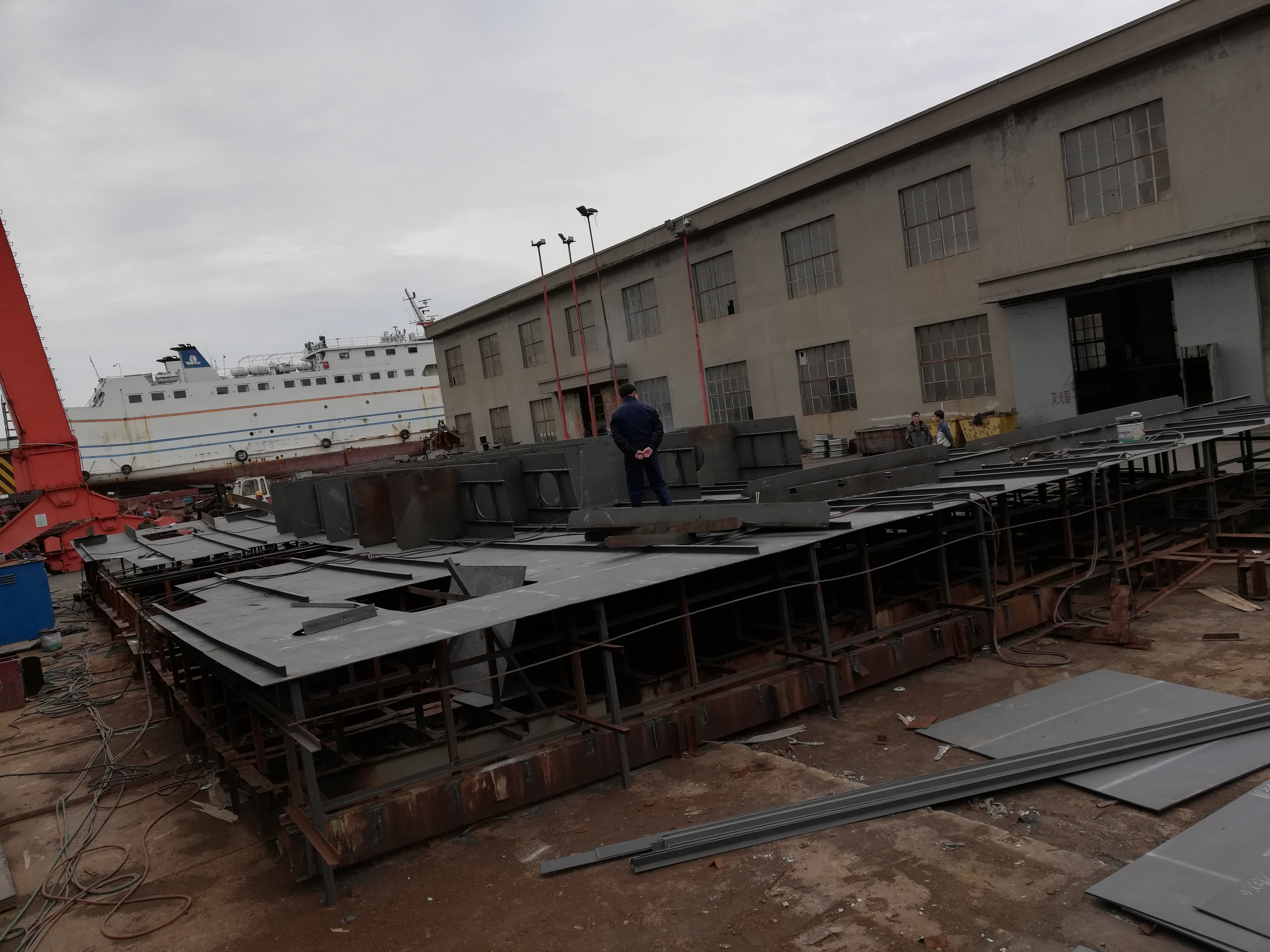 該平臺由2016年重點研發計劃項目“基于固定平臺的海洋儀器設備規范化海上測試技術研究及試運行”和2015年天津市區域示范項目“海上可移動綜合試驗平臺”兩個項目聯合推進平臺的建設工作,自2018年8月初簽訂了建造合同,已開展2個月的建設,目前已完成以下工作:取得當地船檢部門的開工許可;鋼材(板材、型材等)采購;平臺水輪機組支撐架管材采購;輪機設備、舾裝設備、配電系統的采購;電纜、閥件、門窗等配件的采購;平臺主體的施工圖紙制作;鋼材的各個組成部分的下料工作。