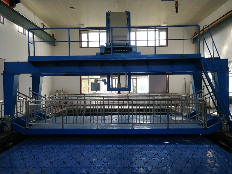 移動實驗平臺按照設計方案制造完成后,實驗室人員于10月13日到制造現場完成基本結構和功能的預驗收。11月3日至5日,開展了移動實驗平臺結構件的進場、安裝等工作。在此過程中,遇到了諸如實驗室空間有限等問題,通過實驗室人員和安裝人員的共同努力,在未破壞實驗室內原有設備的前提下,成功完成了移動實驗平臺的組裝工作。11月6日至7日,開展了移動實驗平臺的調試工作,調試完成后的移動實驗平臺縱向運動范圍15m,深度方向運動范圍不小于2.3m,可接延長桿至6m,小車橫向運動范圍2.3m,回轉角度范圍±360º,回轉控制誤差:不大于±0.1°,水聲測試系統計算機通過RS232通訊接口,采用無線數傳模塊與現場控制器通訊。經調試驗證,移動實驗平臺全部功能均滿足設計方案的指標要求,順利通過驗收。