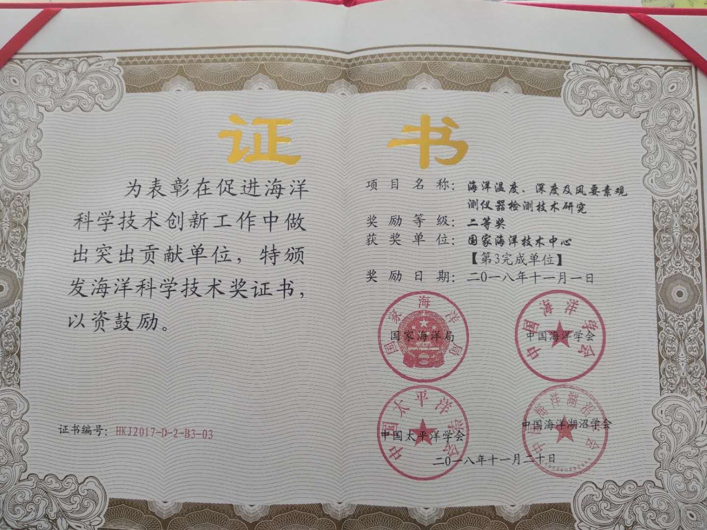 11月20日,中國海洋學會、中國太平洋學會聯(lián)合主辦的第九屆海洋強國戰(zhàn)略論壇暨2017年度海洋科學技術(shù)獎頒獎儀式在廣西北海市舉行。在頒獎儀式上,我中心參與的“海洋溫度、深度及風要素觀測儀器檢測技術(shù)研究”項目獲得二等獎。