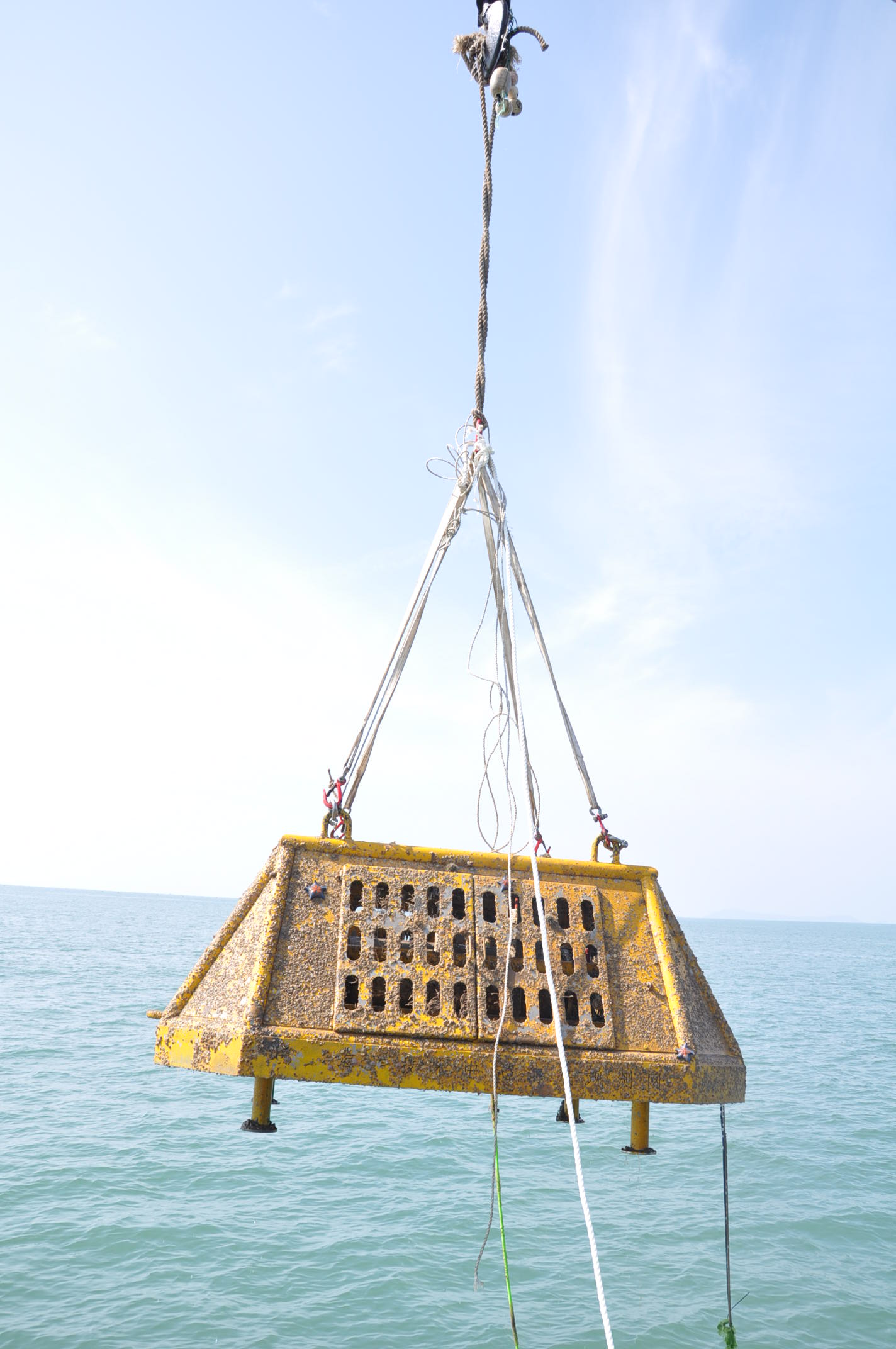 項目組于去年8月、10月和今年5月,對系統開展了三次維護工作,主要包括:更換故障傳感器、清理框架及艙體上的附著海生物以及生態傳感器定標。海上的情況復雜多變,項目負責人制定了詳細的工作計劃,劃分工作組并指定一名組長,明確每個人的分工。蓬萊海域屬于典型的半日潮,維護工作盡量選擇在約2個小時的平潮期,多個工作組需協同作業,包括船只定位、節點打撈、傳感器拆卸、框架及艙體清理等,每次均在有限的時間內完成維護工作。
