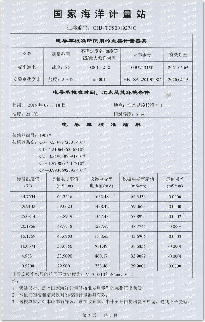 回收后,參試設備OST36M抗污染CTD完成外觀簡單清洗,在國家海洋標準計量中心進行了復測,結果顯示,其電導率最大漂移為0.0235mS/cm,符合課題任務書、海試大綱中關于抗污染能力的考核指標要求。