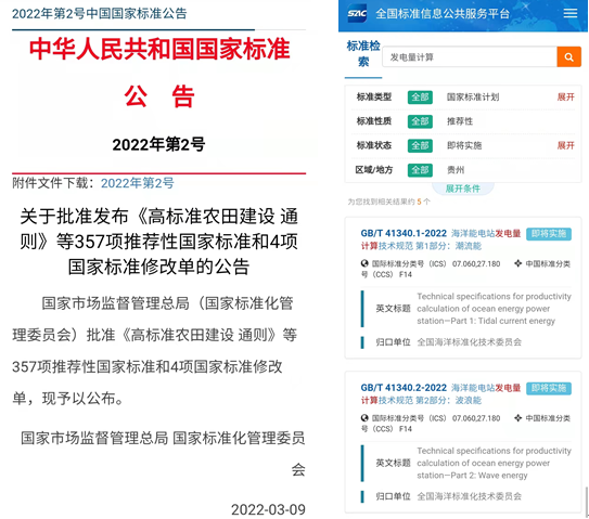 業(yè)務工作近日,我中心承擔的《海洋能電站發(fā)電量計算技術規(guī)范 第1部分:潮流能》(GB/T 41340.1-2022)和《海洋能電站發(fā)電量計算技術規(guī)范 第2部分:波浪能》(GB/T 41340.2-2022),經國家市場監(jiān)督管理總局、國家標準化管理委員會批準,于2022年3月9日正式發(fā)實施?!兑?guī)范》確立了海洋能電站發(fā)電量計算的流程、微觀選址和發(fā)電量計算方法,規(guī)定了潮流能和波浪能電站發(fā)電量計算的工作流程、陣列規(guī)模的等級劃分、資料收集、現(xiàn)場觀測、數(shù)值模擬、微觀選址、發(fā)電量計算方法和技術報告的編寫內容,是指導我國海洋能電站發(fā)電量計算的基礎性標準?!兑?guī)范》的正式實施將為潮流能和波浪能電站發(fā)電量計算提供支撐和依據(jù),研制海洋能電站發(fā)電量計算技術規(guī)范,規(guī)范海洋能發(fā)電站計算方法,是大規(guī)模開發(fā)利用海洋能資源的重要技術保障。(海洋能發(fā)展中心 吳國偉)