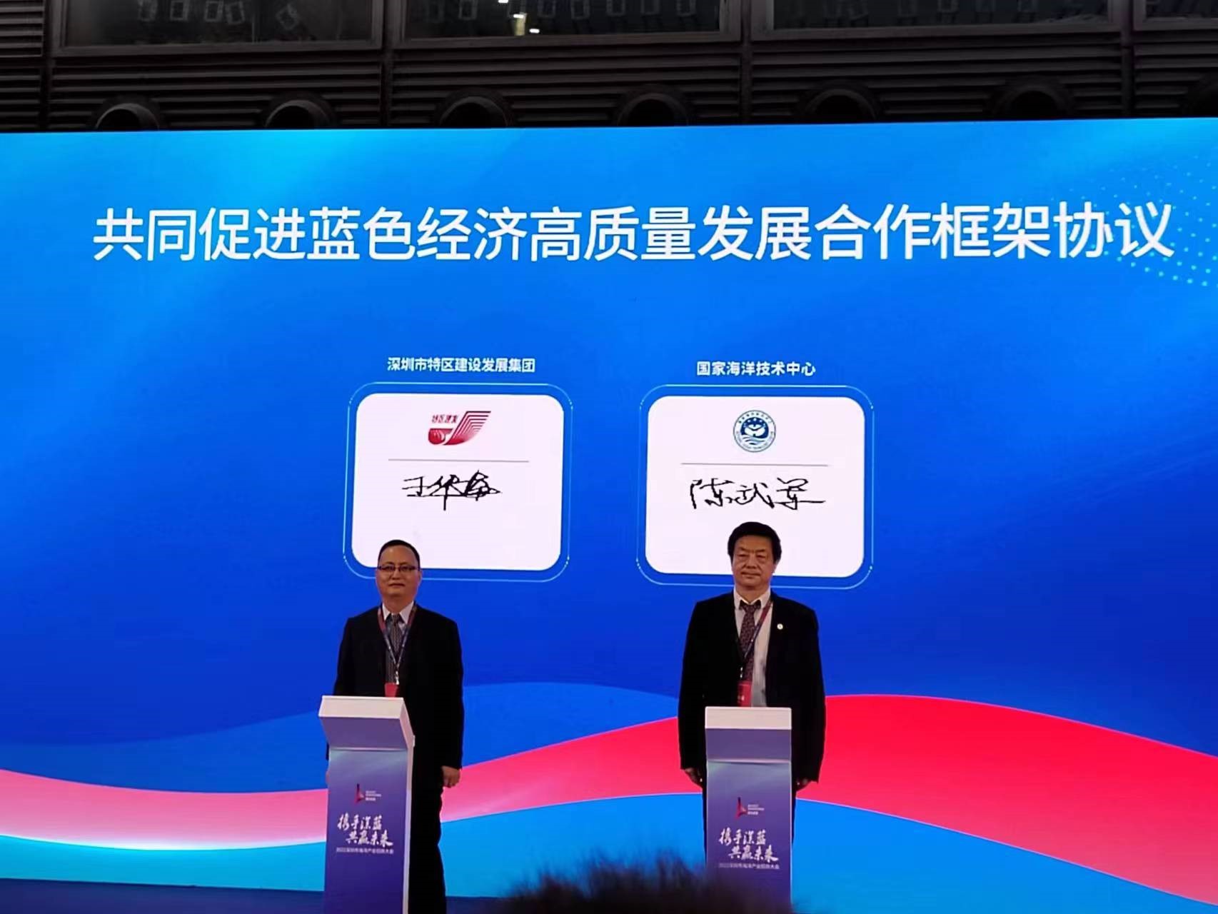 10月24日上午,國家海洋技術中心黨委書記陳武軍與深圳市特區建設發展集團有限公司副總經理王華本在深圳2022中國海洋經濟博覽會期間,簽署《共同促進藍色經濟高質量發展戰略合作協議》。協議本著“共擔使命、共謀發展”的宗旨,充分發揮雙方海洋產業平臺、行業資源和技術優勢,借助深圳全球海洋中心城市建設契機,在海洋新技術、海洋產業項目、海洋展會等領域開展深層次合作,攜手促進藍色經濟高質量發展。