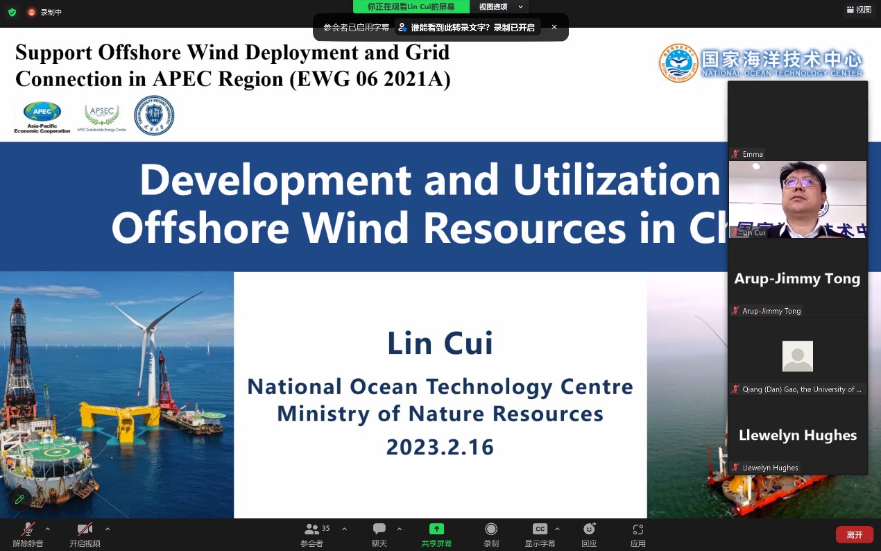 業(yè)務(wù)工作2023年2月15日和16日上午,天津大學(xué)APEC可持續(xù)能源中心(APSEC)以線上會議的形式舉辦了“支持APEC區(qū)域海上風(fēng)電部署和并網(wǎng)”國際研討會。此次研討會是天津大學(xué)承擔(dān)的APEC基金項目(EWG-06-2021A)系列活動的一部分,會議邀請了來自國際可再生能源署(IRENA)和世界海上風(fēng)電論壇(WFO)等國際性的可再生能源與海上風(fēng)電機(jī)構(gòu),以及美國Marathon Capital、越南CTE Wind公司、韓國風(fēng)能產(chǎn)業(yè)協(xié)會、日本海上技術(shù)安全研究所、澳大利亞國立大學(xué)、英國ARUP工程顧問公司等十余家國內(nèi)外專業(yè)技術(shù)協(xié)會、金融機(jī)構(gòu)、能源和電網(wǎng)企業(yè)的報告人,分享全球海上風(fēng)電發(fā)展的最新動態(tài),交流APEC地區(qū)的海上風(fēng)電技術(shù)與開發(fā)經(jīng)驗,為APEC區(qū)域的海上風(fēng)電發(fā)展搭建交流與合作平臺。