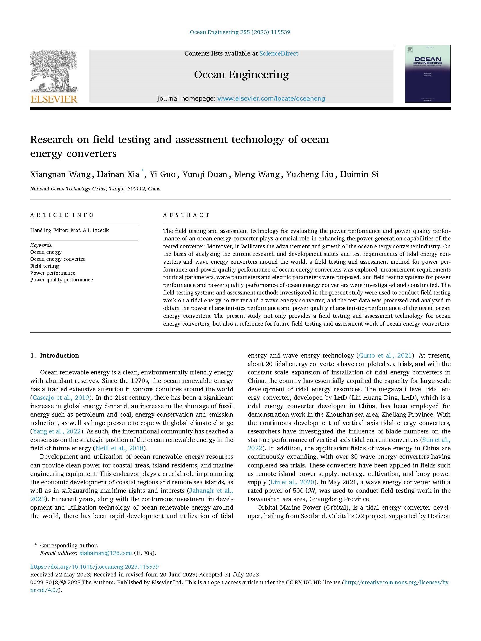 近日,我中心海洋能發電裝置現場測試與評價團隊在海洋工程領域國際TOP期刊Ocean Engineering發表題為“Research on field testing and assessment technology of ocean energy converters”的學術論文,該文對海洋能發電裝置現場測試與評價方法進行了全面的論述,并介紹了應用于我國海洋能發電裝置現場測試與評價的情況。