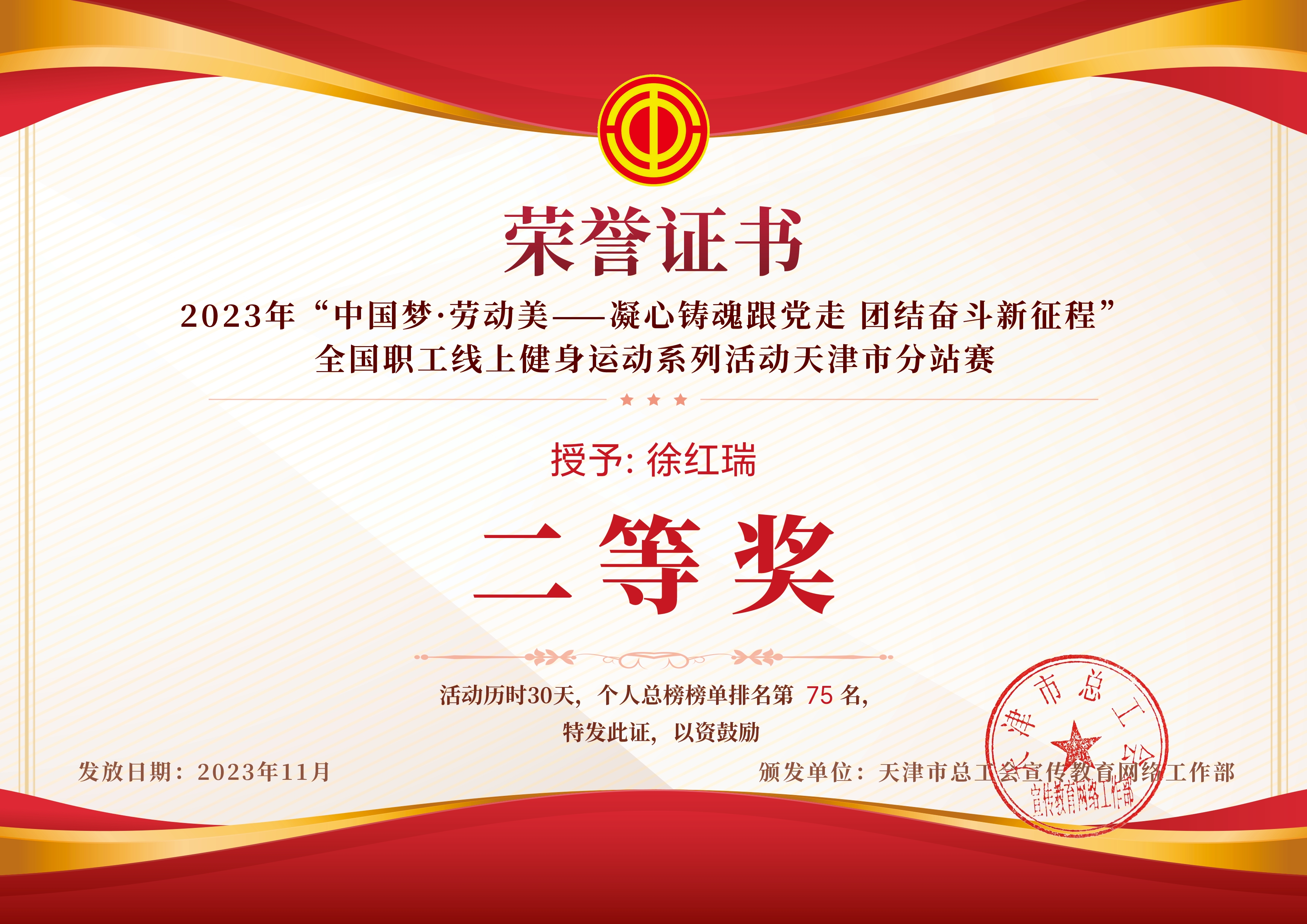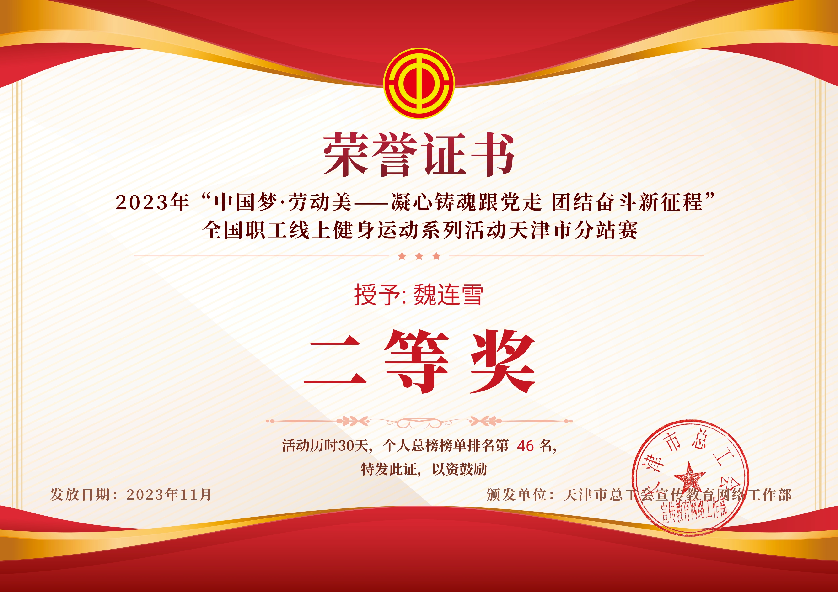 日前,天津市總工會發布了全國職工線上健身運動系列活動天津市分站賽的獲獎名單。我中心榮獲“優秀組織獎”。