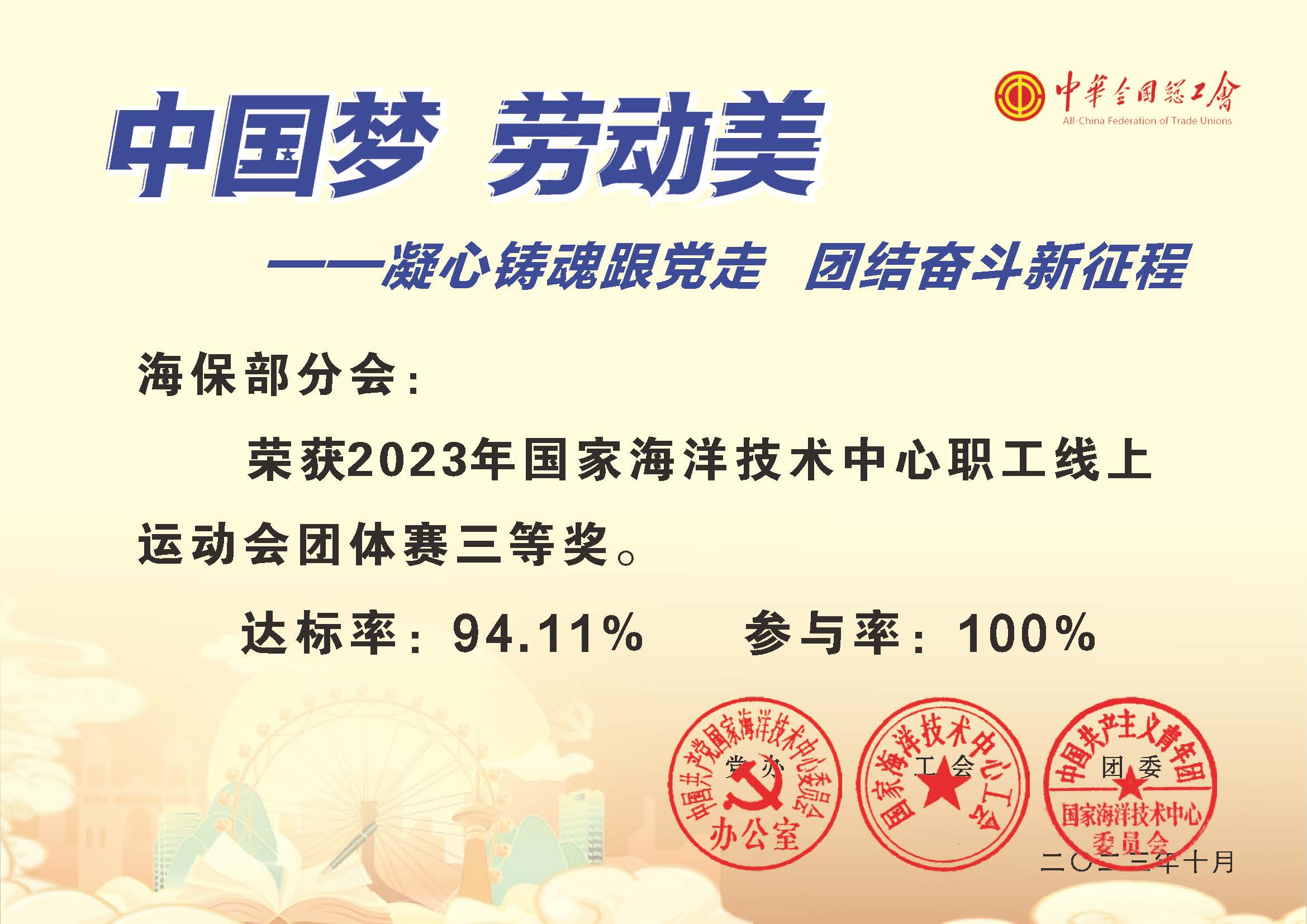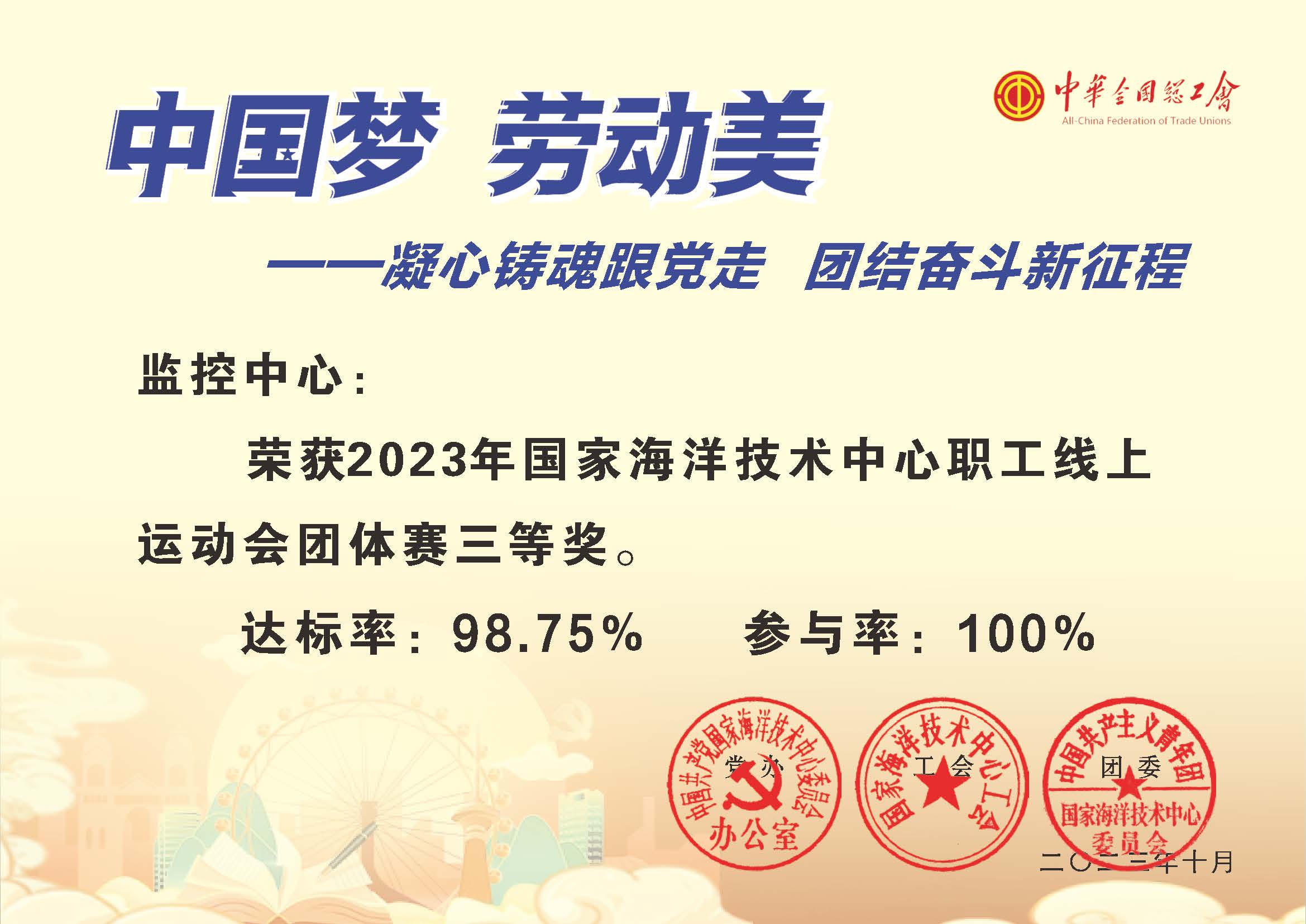 在同期開展的中心線上運動會中,綜合分會參與率和達標率兩個數據,海洋能項目辦分會總排名第一榮獲“一等獎”,試驗場中心分會、黨辦紀辦分會獲“二等獎”,監控中心分會、質管處項目處分會、海保部分會獲“三等獎”,中心有157人30天全部達標獲“全勤獎”。