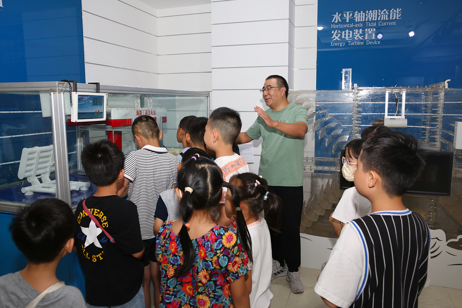 中心作為全國海洋科普教育基地,每年都會面向校園、面向社會開展大量科普工作,這也使得托管班有了“近水樓臺先得月”的優勢,班上許多學生家長就曾經為不同年齡段的學生講授過海洋領域的各類科學知識,托管班也適時組織學生們到中心海洋能成果展廳、海洋動力環境實驗室等場所參觀,直觀感受海洋科普。于是,通過講座、參觀等方式引導學生認識海洋、熱愛海洋、保護海洋就成了每期托管班的必修課。除了專業領域,家長們還各盡所能,把中國歷史、世界地理、硬筆書法、無人機模擬操控等課程搬上課堂,讓孩子們在暑假期間豐富知識體系、培養興趣愛好。工會在暑期組織舉辦文學、朗誦、書法等專家講座時,也會把托管學生納入進來,讓職工和子女共同學習,形成獨特的親子課堂。