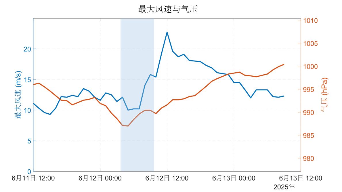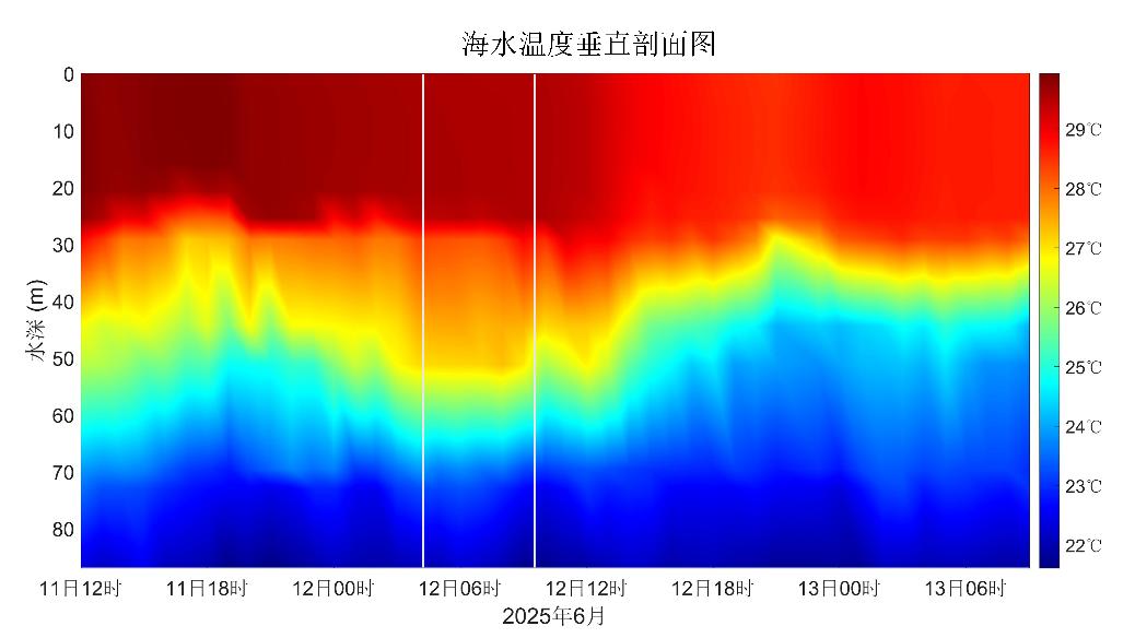 浮標此次捕獲的數據能夠有力支撐對臺風的氣象、水文、生態及上層海洋海流、溫鹽演變過程的分析6月12日6時左右,“蝴蝶”臺風中心抵達浮標所在海域,中心最低氣壓987hPa。過境后,風速急劇增大,浮標觀測到最大風速22.7m/s,最大波高7.8m。浮標剖面觀測數據顯示,受臺風影響,上層海洋混合加劇,水溫下降,鹽度降低,流速增強,混合層深度明顯加深。